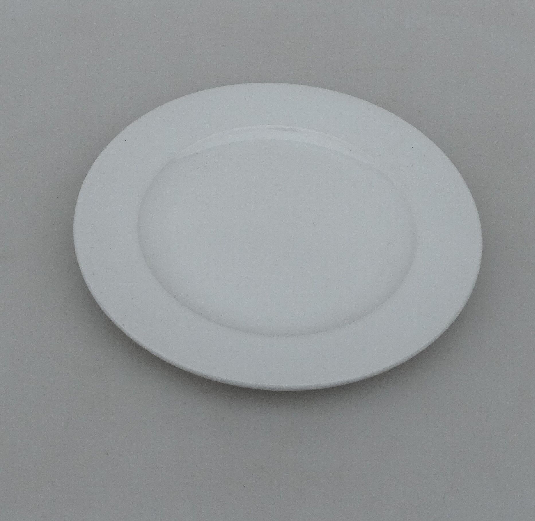 Talíř na obrázku je jednoduchý, bílý a keramický. Má hladký, lesklý povrch, mírně zvýšený okraj a mělké dno. Nepůsobí dekorativně – je zcela bez vzoru, textu nebo reliéfu. Celkově jde o univerzální, minimalistický talíř vhodný pro běžné stolování i do restaurace.